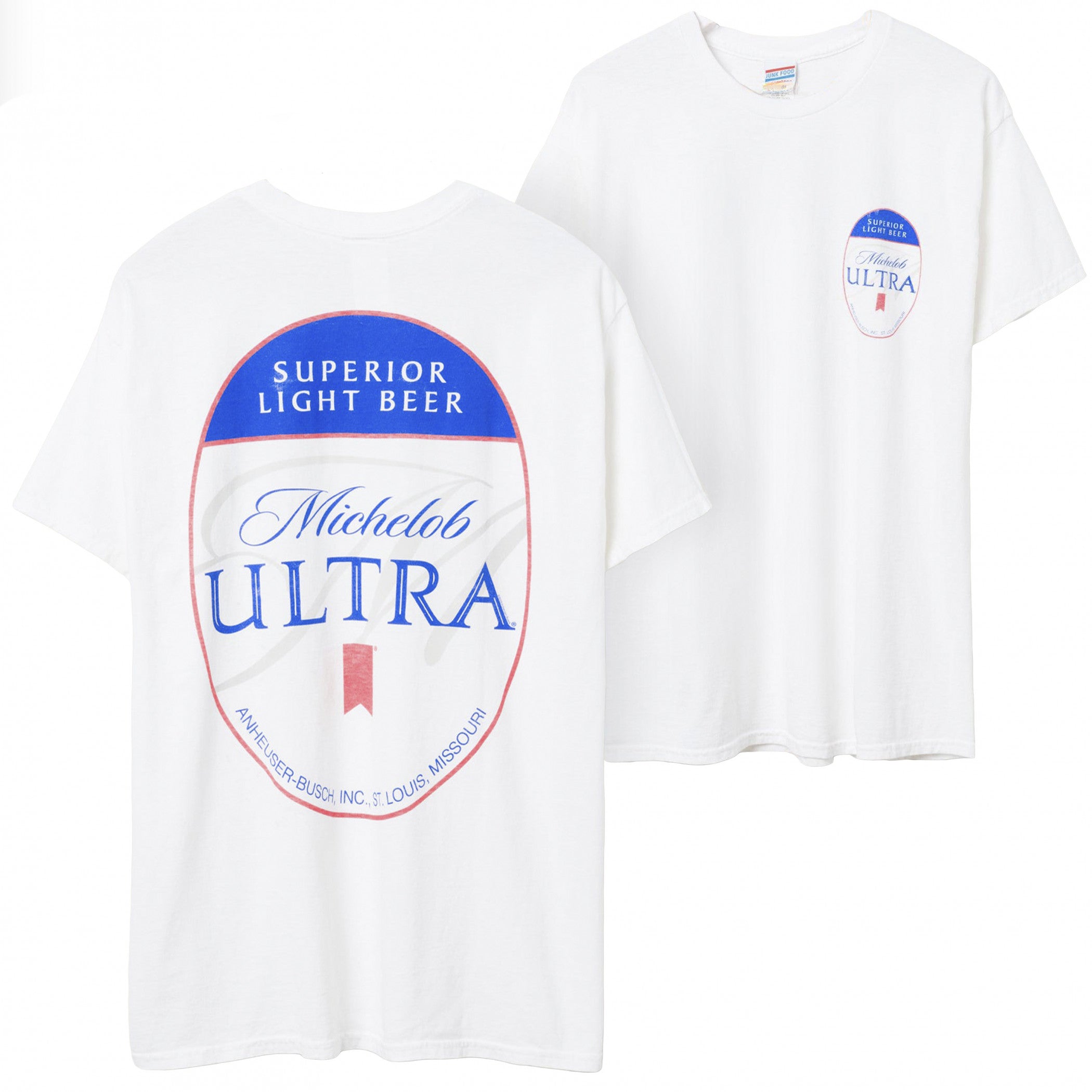 Officially licensed Michelob Ultra Oval Logo T-Shirt by Junk Food. This white "Michelob" t-shirt by "Junk Food" is made from cotton and features a classic "Michelob Ultra" oval logo printed on the front and back.