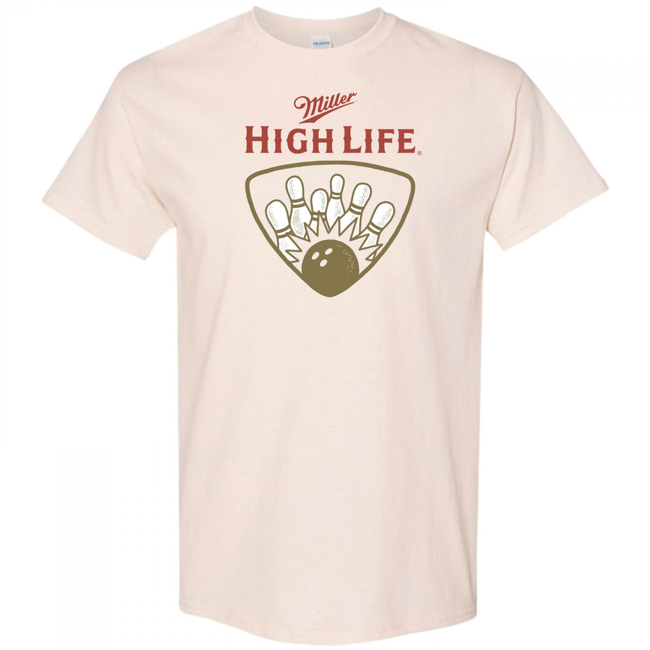 Officially licensed Miller High Life Bowling Strike Light T-Shirt. This beige "Miller High Life" t-shirt is made from cotton and features a classic "Miller High Life Bowling Strike" logo design printed on the front.