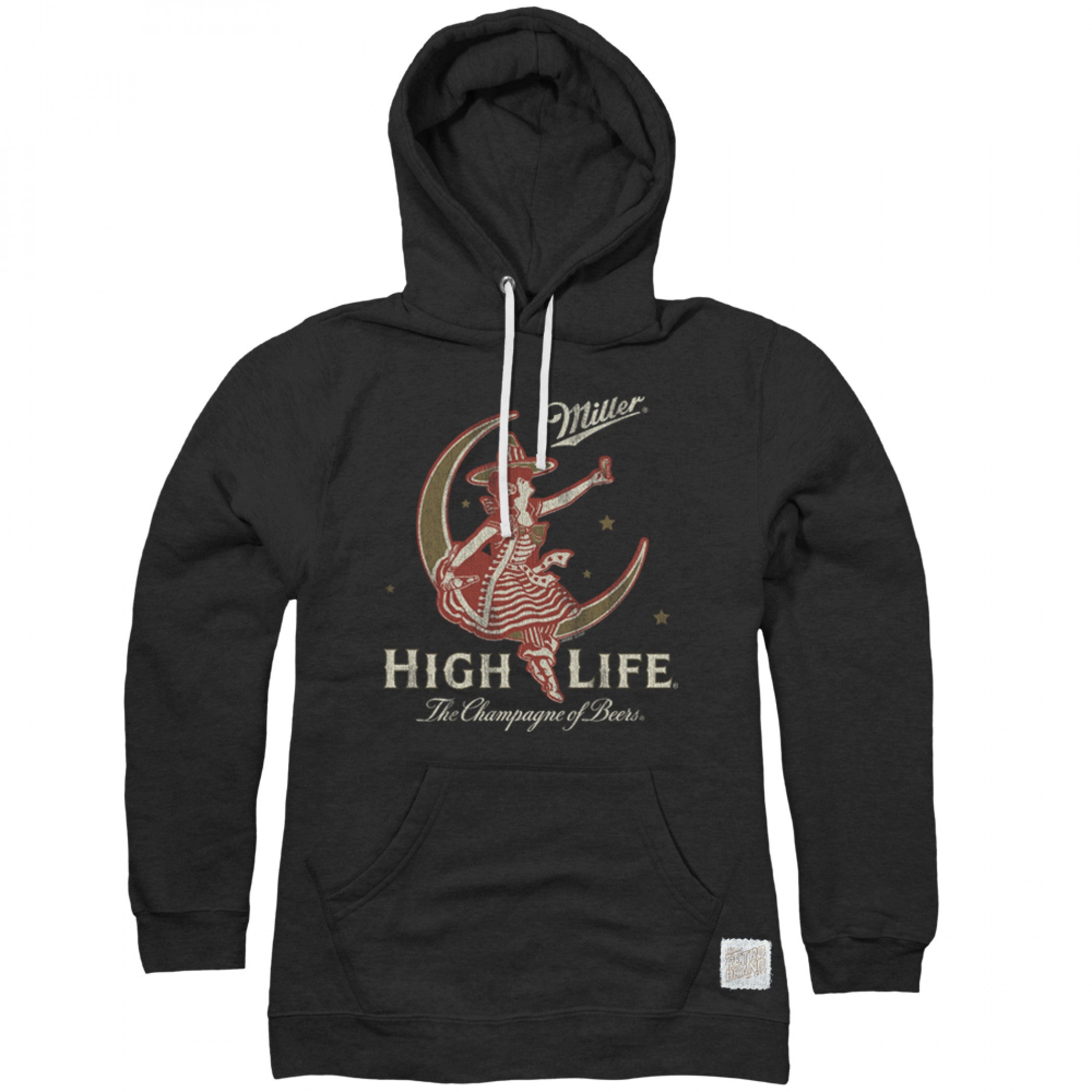 Officially licensed Miller High Life Girl In The Moon Hoodie. Made from a cotton/poly blend, this black "Miller High Life" pullover hoodie features the classic "Miller High Life Girl In The Moon" logo on the front.
