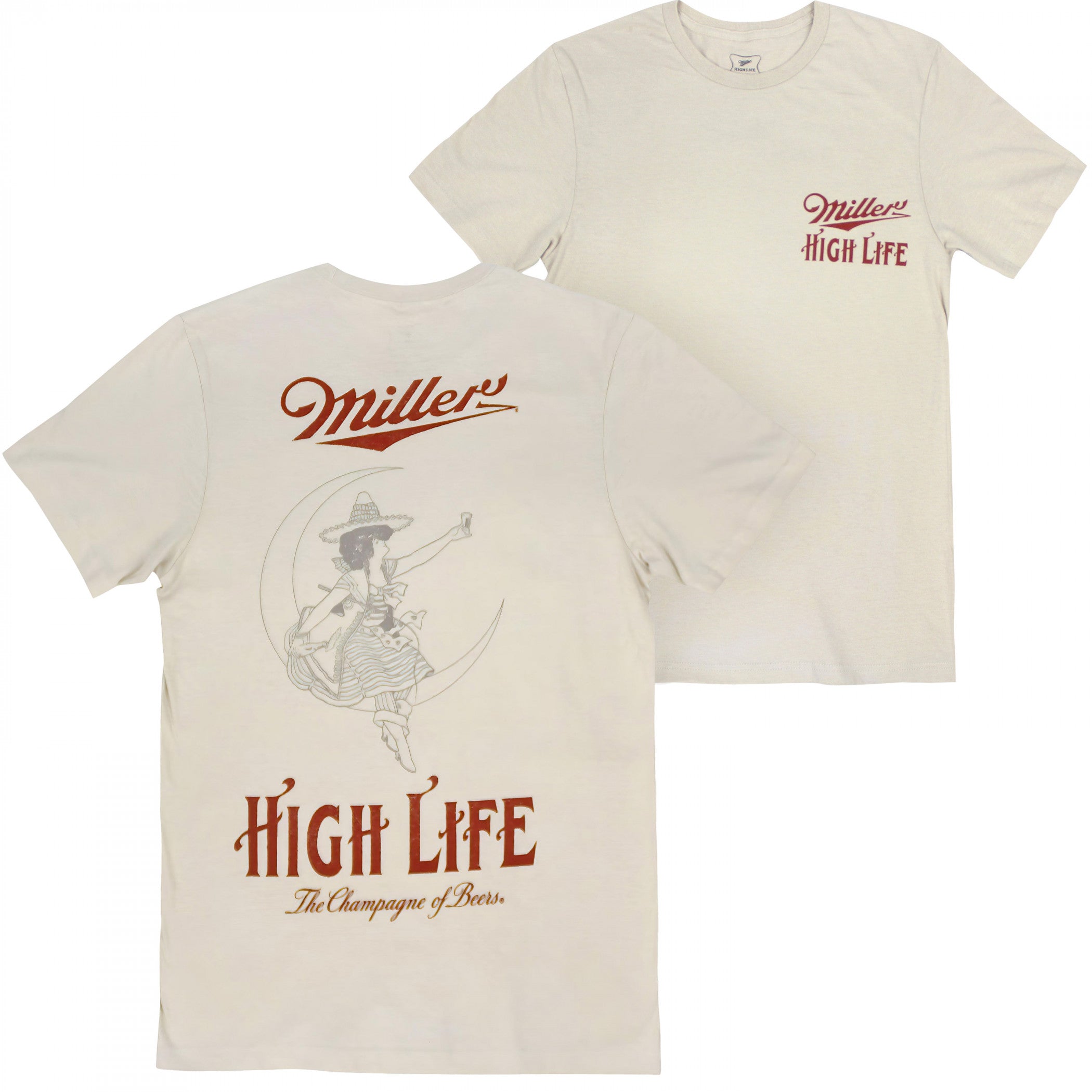 Officially licensed Miller High Life Girl in the Moon T-Shirt. This grey "Miller High Life" t-shirt is made from cotton and features a classic "Miller High Life" Girl in the Moon logo design printed on the front and the back.