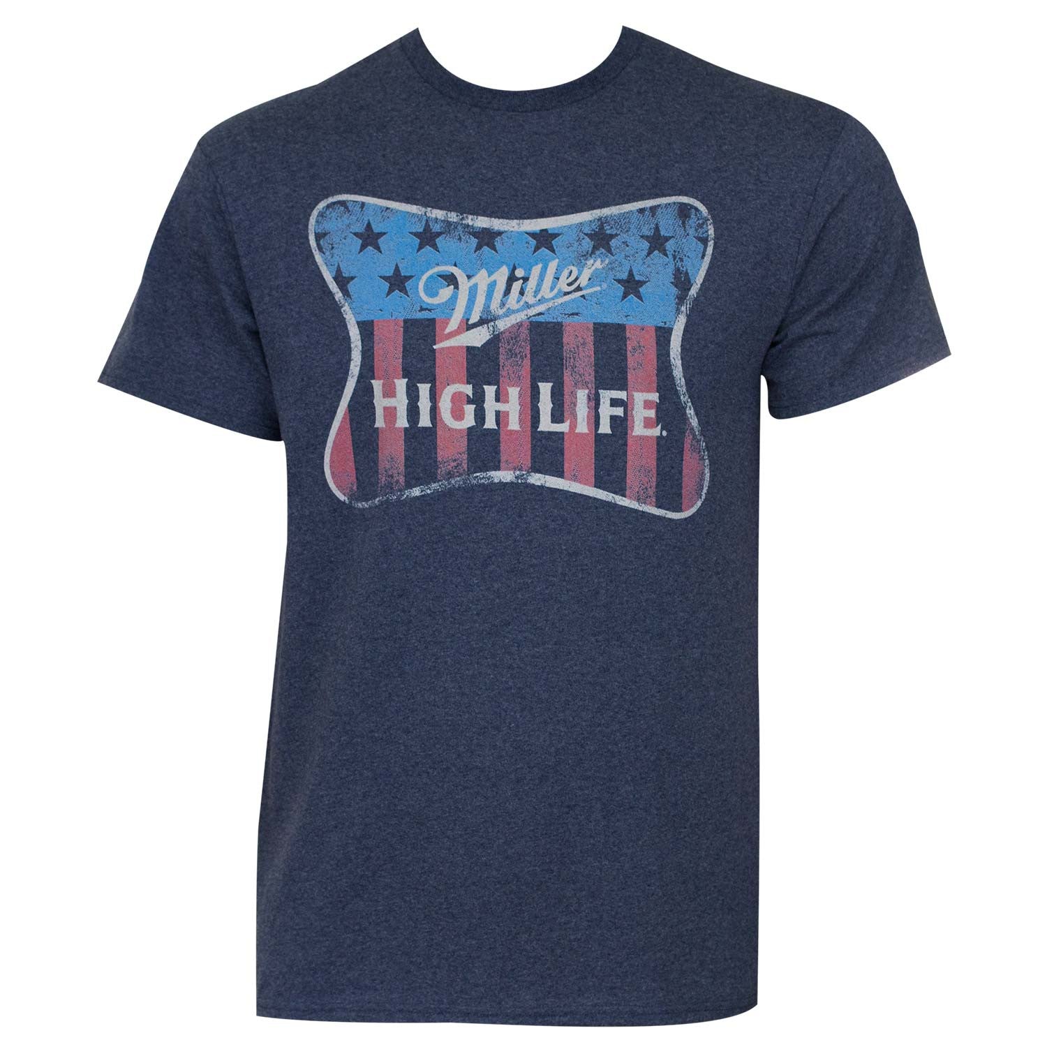 Men's navy blue Miller High Life t-shirt. Made from a cotton/poly blend, this shirt features a vintage "Miller High Life" american flag image on the front. Officially licensed.