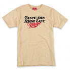 Officially licensed Miller Taste the High Life T-Shirt. This beige "Miller High Life" t-shirt is made from cotton and features a vintage "Miller Taste the High Life" logo design printed on the front.