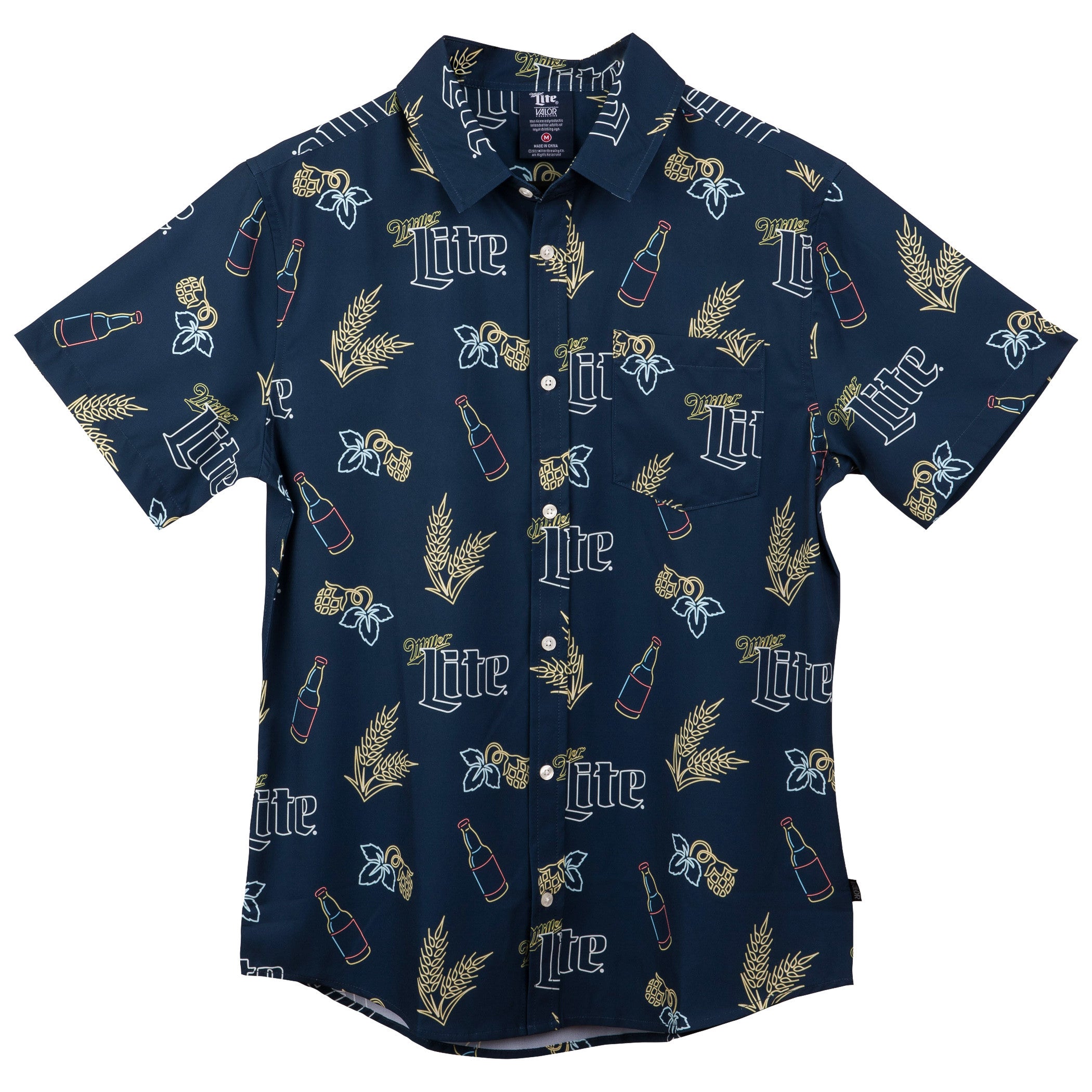 Officially licensed Miller Lite Neon Bottles Hawaiian Shirt. This blue "Miller Lite" Hawaiian Button Up Shirt is made from cotton and features a cool "Miller Lite" Neon Bottles all-over print design.