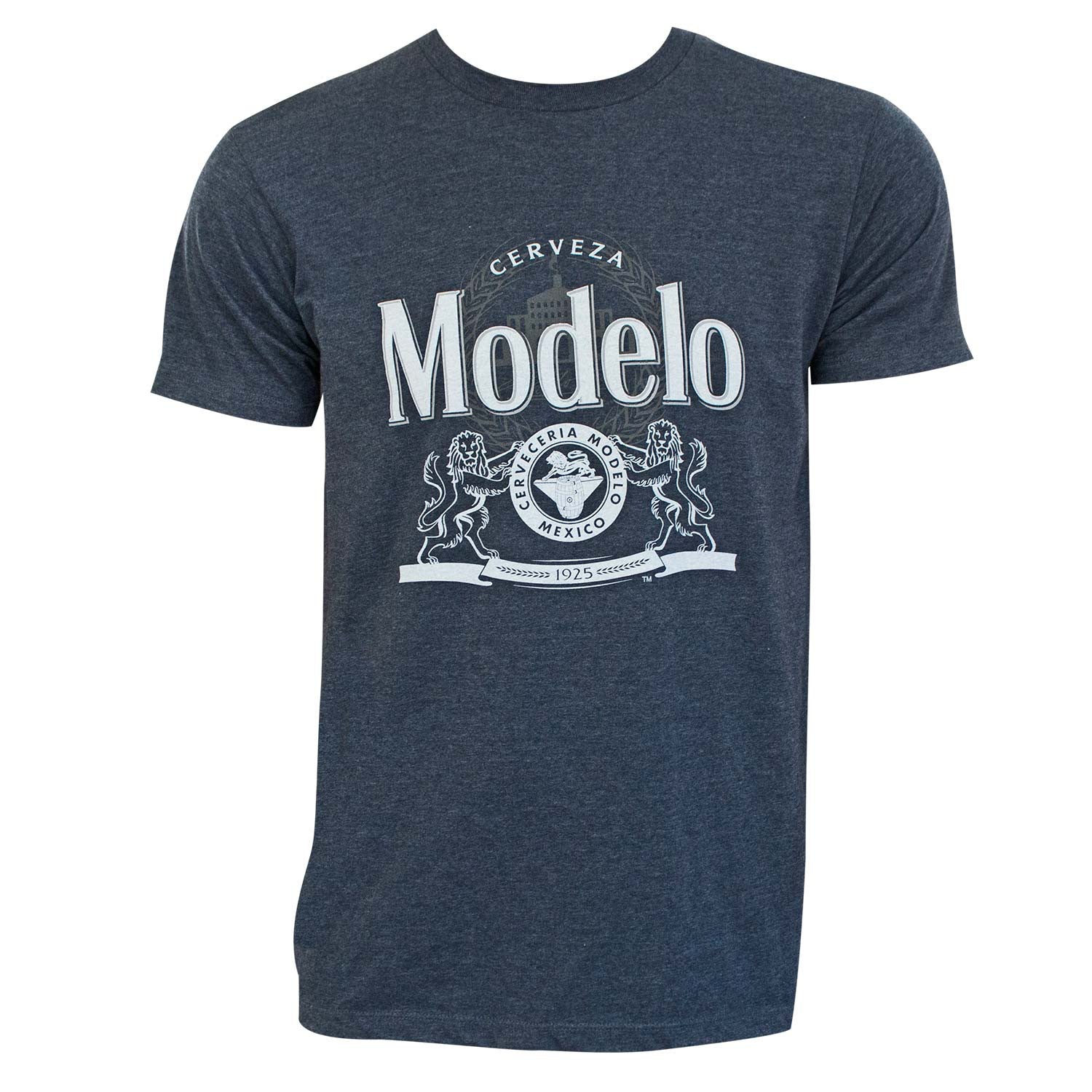 Men's blue Modelo t-shirt. Made from a cotton/poly blend, this tee features a "Modelo" crest logo on the front. Officially licensed.