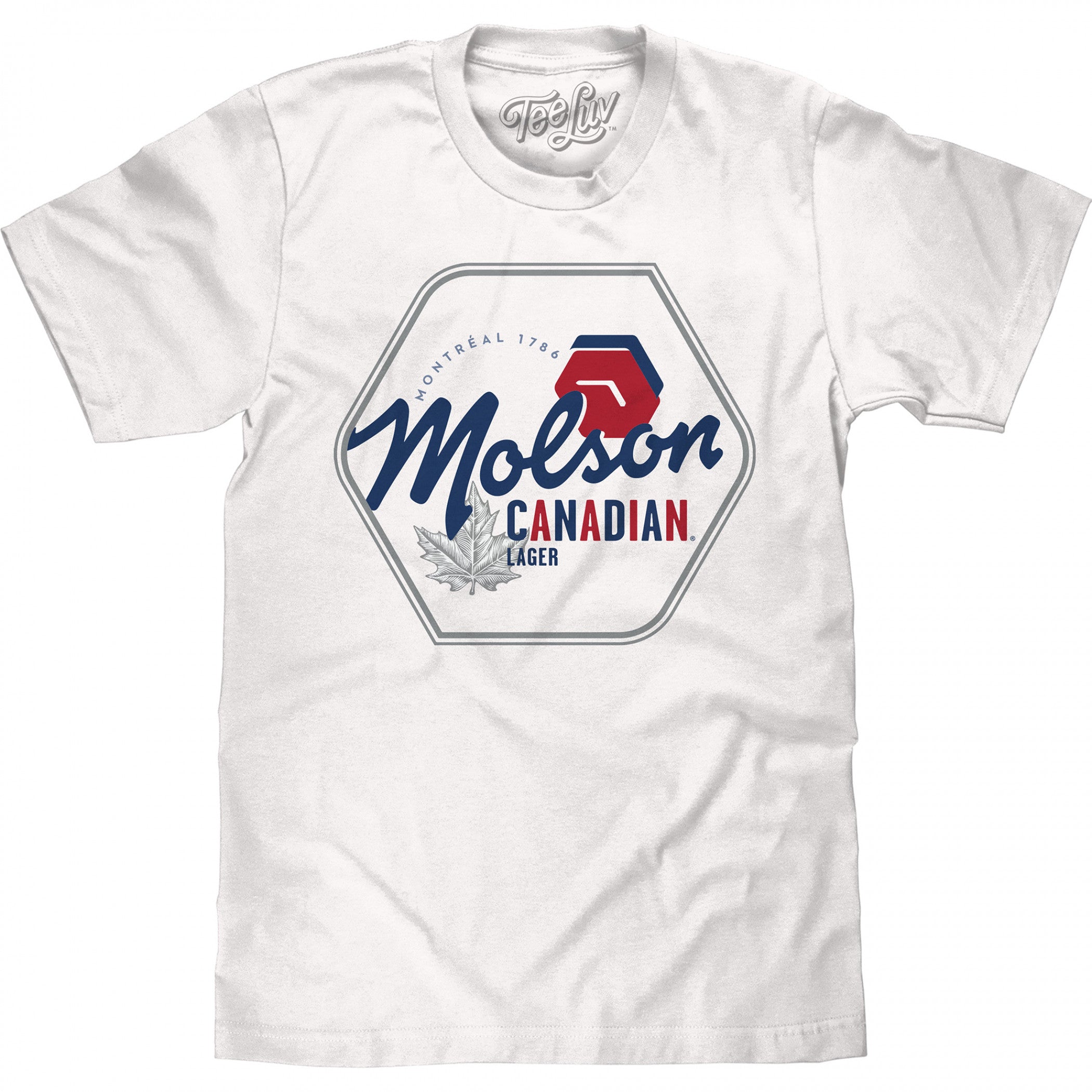 Officially licensed Molson Canadian Lager Hexagon Logo T-Shirt. This white "Molson Canadian Lager" t-shirt is made from cotton and features a classic "Molson Canadian Lager Hexagon" logo design on the front.