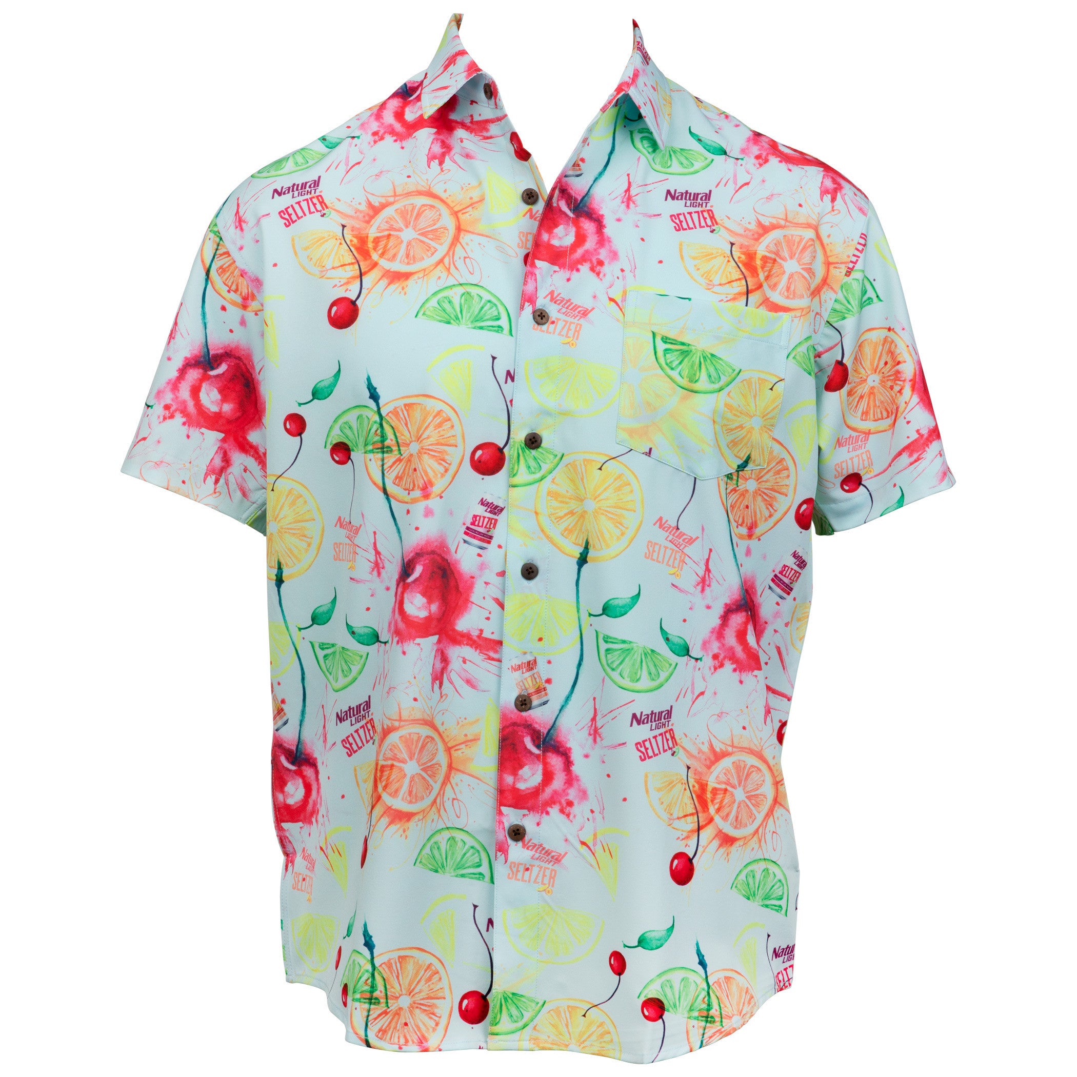 Officially licensed Natty Seltzer Natural Light Aloha Beaches Tropical Bros Hawaiian Shirt. Made from polyester, this button up features the "Natty Seltzer " logo and fruits printed all over.