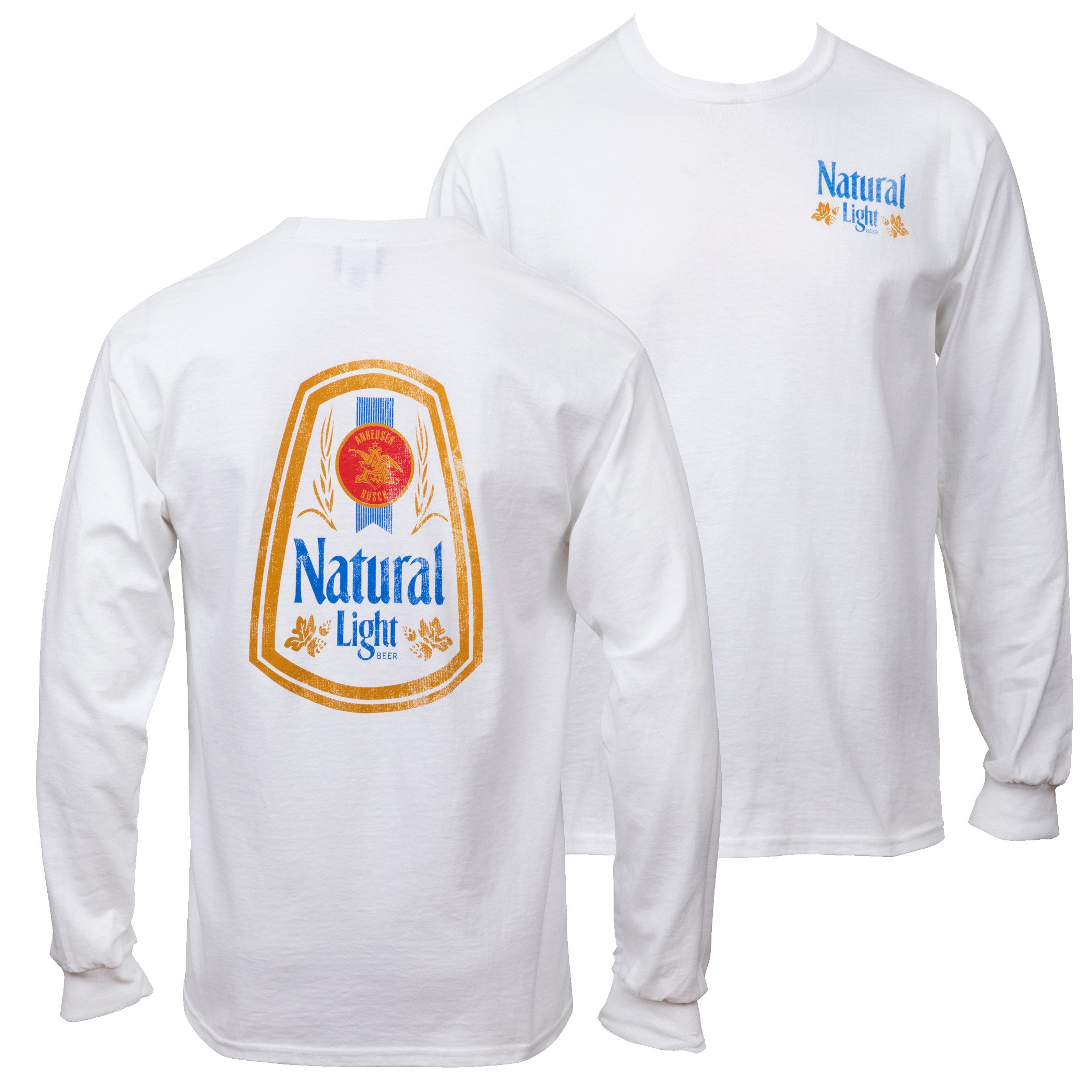 Officially licensed men's Natural Light Long Sleeve Front and Back Print Shirt. Comes in white and features a “Natural Light" logo on the front and back. Made from cotton.