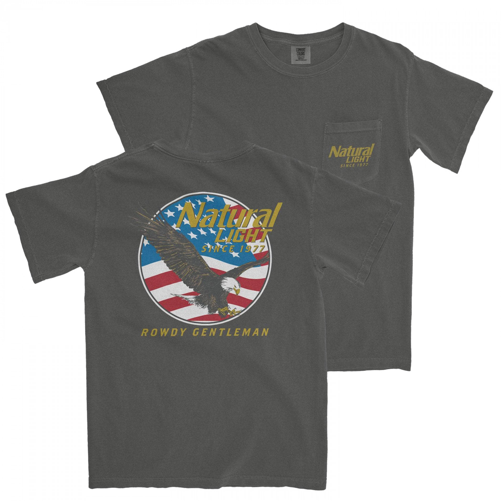 Officially licensed Natural Light Since 1977 Rowdy Gentleman Pocket T-Shirt. This grey pocket "Natural Light " t-shirt is made from cotton and features a classic "Natural Light Since 1977 Rowdy Gentleman" eagle back print and the "Natural Light" logo on the front pocket.