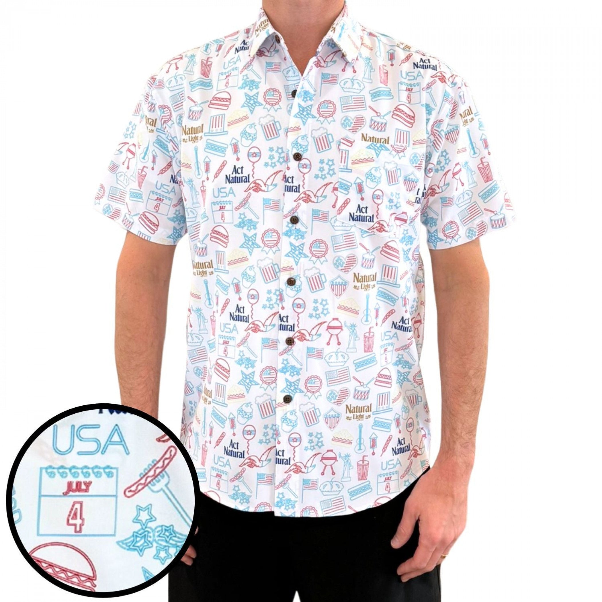 Officially licensed Natural Light Weekend BBQ Tropical Bros. Hawaiian Shirt. This white "Tropical Bros. x Natural Light" Hawaiian Shirt is made from polyester quad stretch material and features a "Natural Light Weekend BBQ" all-over print and relaxed fit.