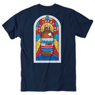Officially licensed Rowdy Gentleman brand tee for men in navy blue. Shows off a stained glass design on the back and a smaller logo on the front. 100% cotton.