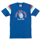 Officially licensed Pabst Blue Ribbon Barber Since 1844 T-Shirt. This blue and white "Pabst Blue Ribbon" t-shirt is made from cotton and features a classic "Pabst Blue Ribbon - Since 1844" Barber logo on the front and striped sleeves.