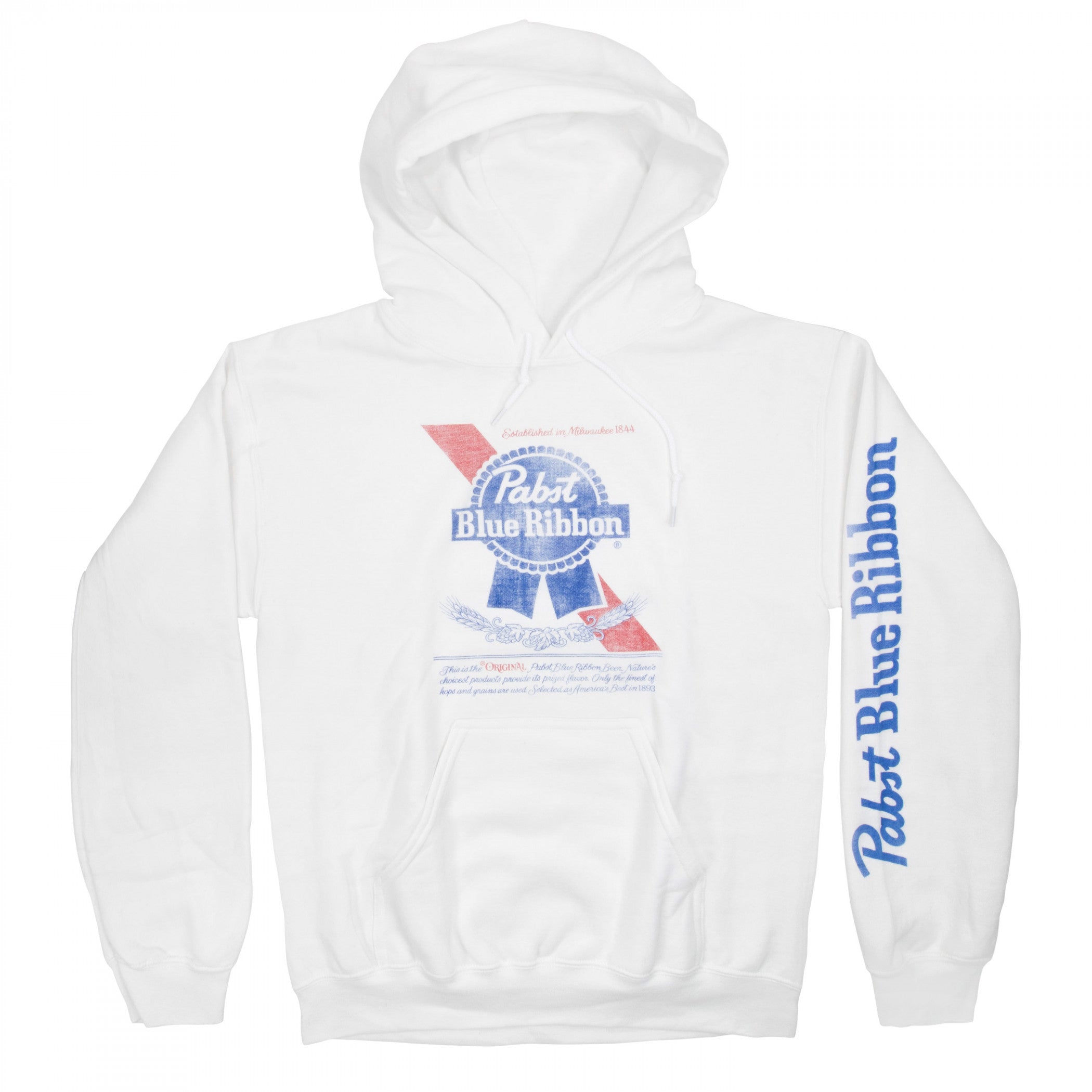 Officially licensed Pabst Blue Ribbon Distressed Classic Logo Pullover Hoodie. This white and blue "Pabst Blue Ribbon" pullover hoodie is made from cotton and features a distressed "Pabst Blue Ribbon" logo printed on the front and sleeve.