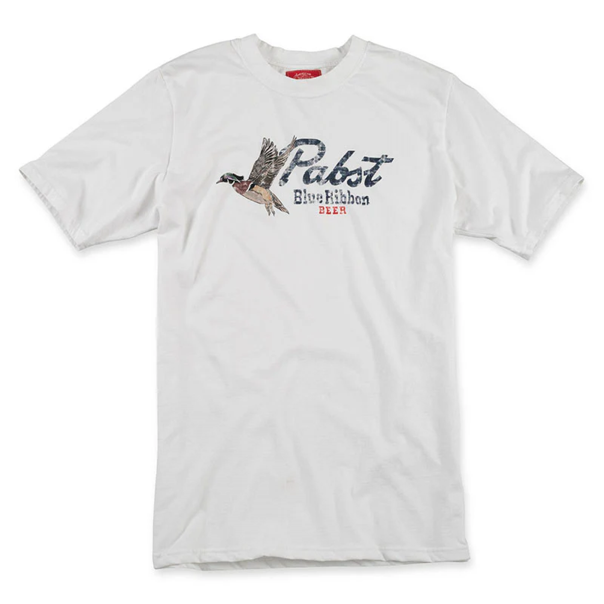 Officially licensed Pabst Blue Ribbon Duck Hunting T-Shirt. This white "Pabst Blue Ribbon" t-shirt is made from cotton and features a classic "Pabst Blue Ribbon Duck Hunting" logo printed on the front.