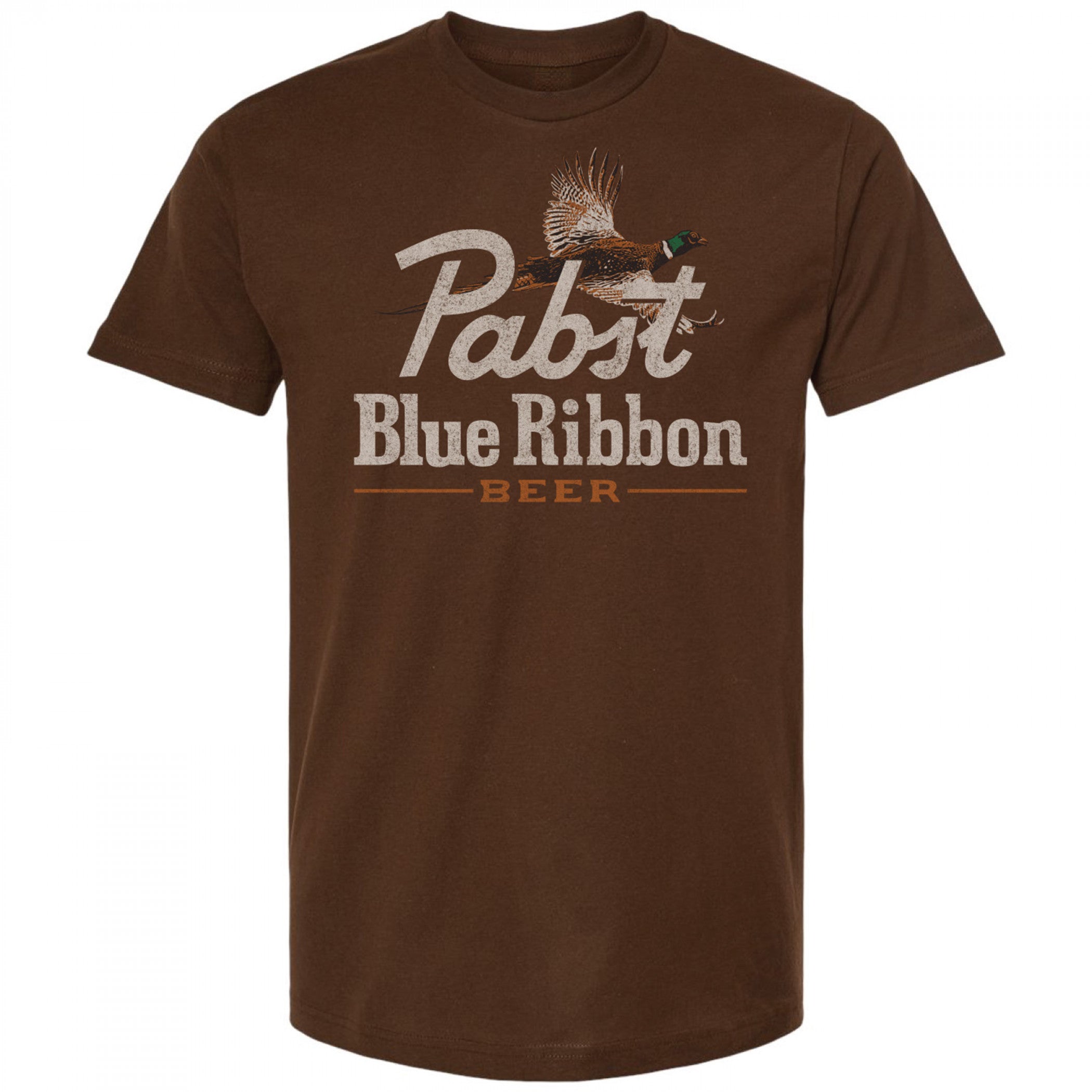 Officially licensed Pabst Blue Ribbon Pheasant Hunting T-Shirt. This brown "Pabst Blue Ribbon" t-shirt is made from cotton and features a classic "Pabst Blue Ribbon" Pheasant Hunting logo printed on the front.