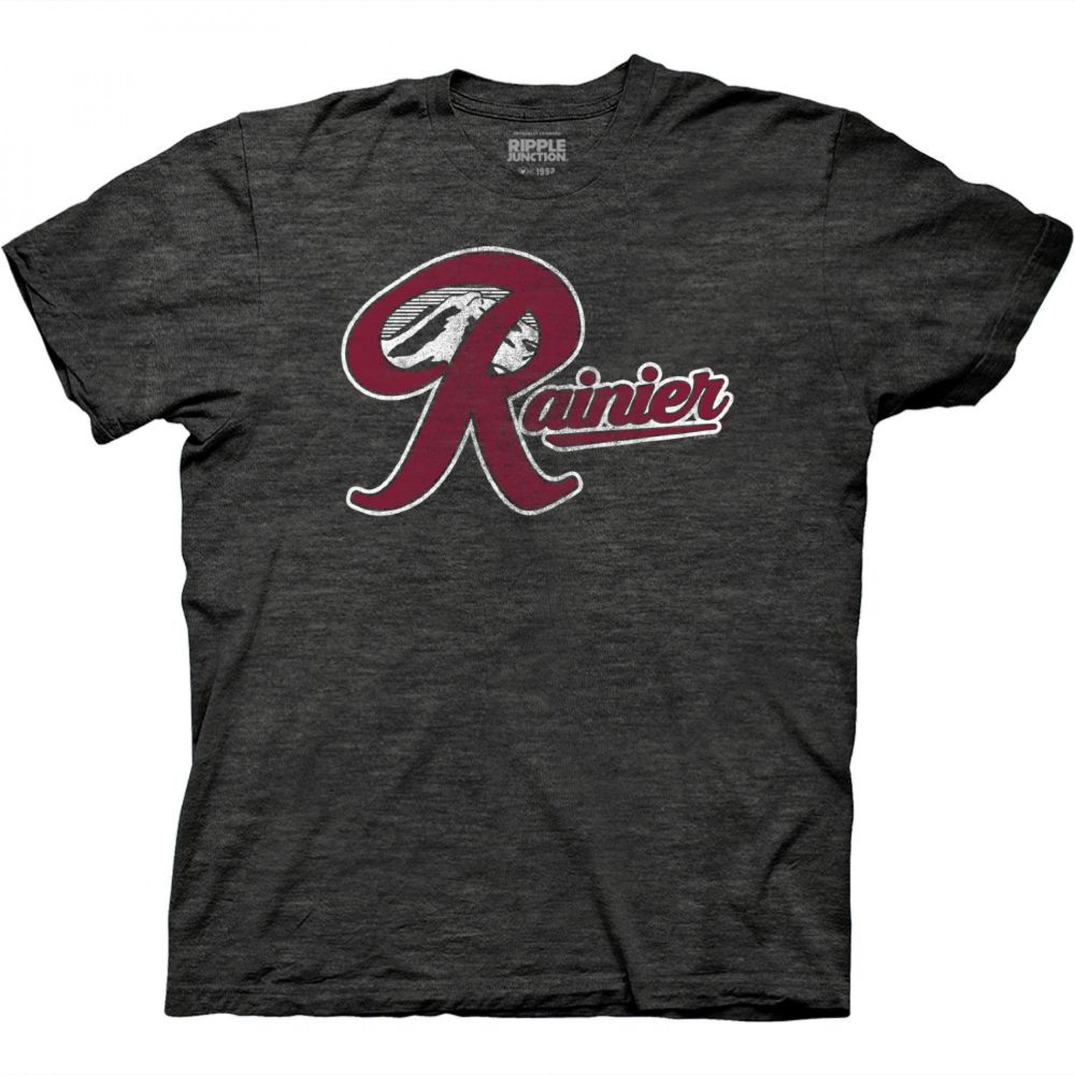 Officially licensed Rainier Vintage Large R Logo T-Shirt. This gray "Rainer Beer" t-shirt is made from cotton and features a vintage large "Rainer R" logo design on the front.