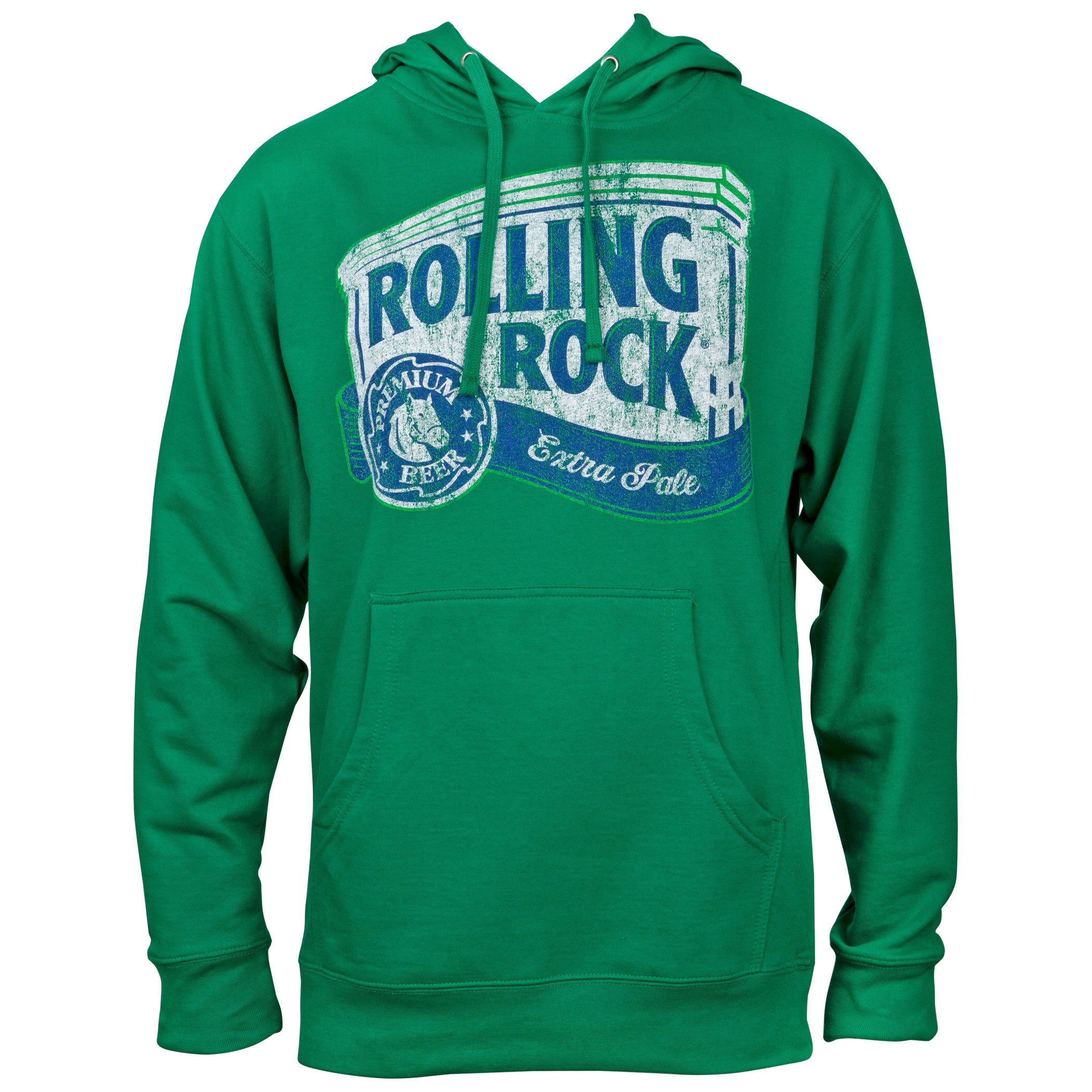 Officially licensed Rolling Rock Green Hoodie. Made from a cotton/poly blend, this green pullover hoodie features the authentic "Rolling Rock" logo on the front.