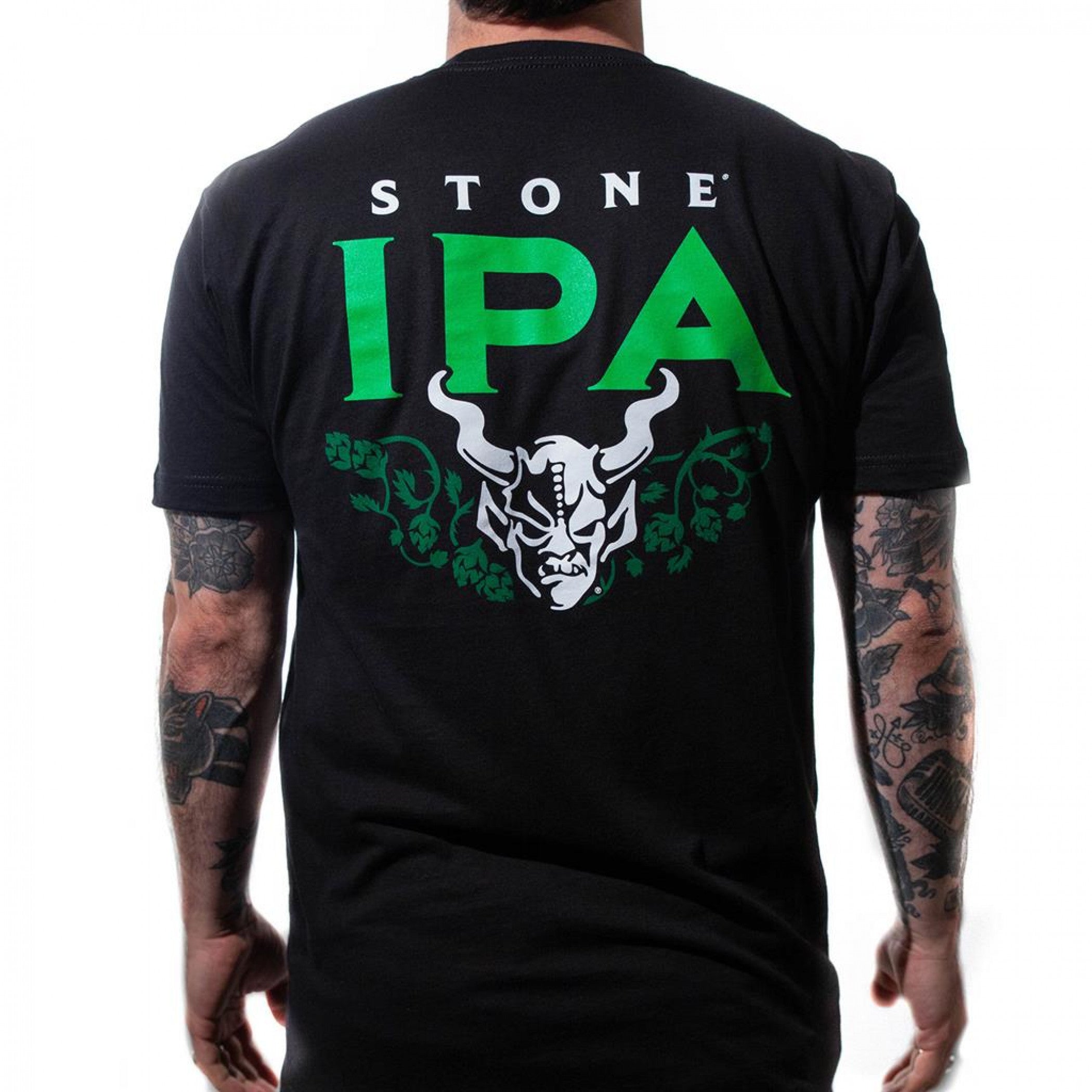 Officially licensed Stone Brewing IPA t-shirt. Features the "Stone Brewing IPA" logo and mascot on the front and back of a black cotton t-shirt.