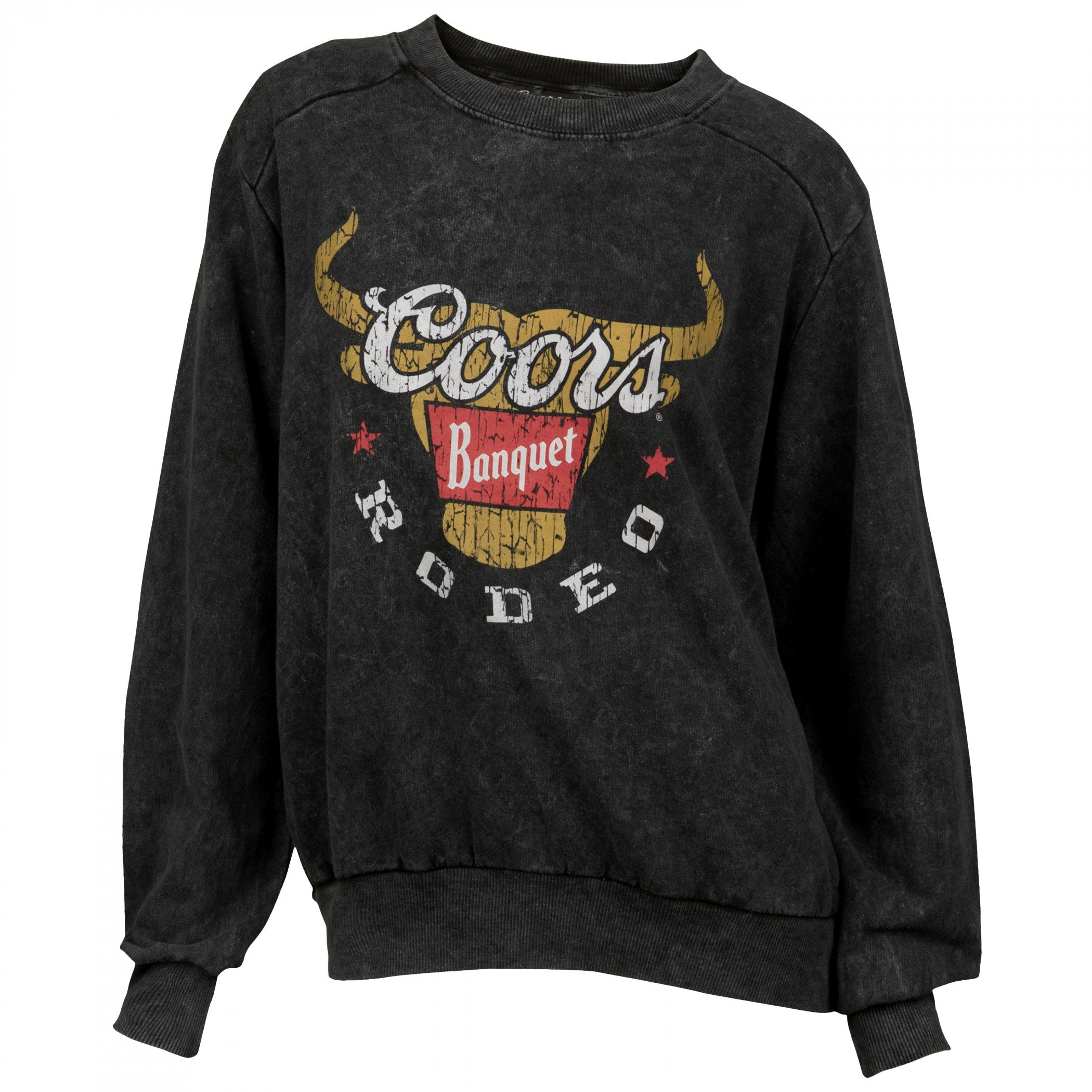 Officially licensed Coors Banquet Rodeo Long Horns Logo Black Mineral Wash Women's Crew Sweatshirt. This black mineral wash "Coors Banquet" Women's Crew Sweatshirt is made from cotton and features a classic "Coors Banquet Rodeo" Long Horns Logo printed on the front.
