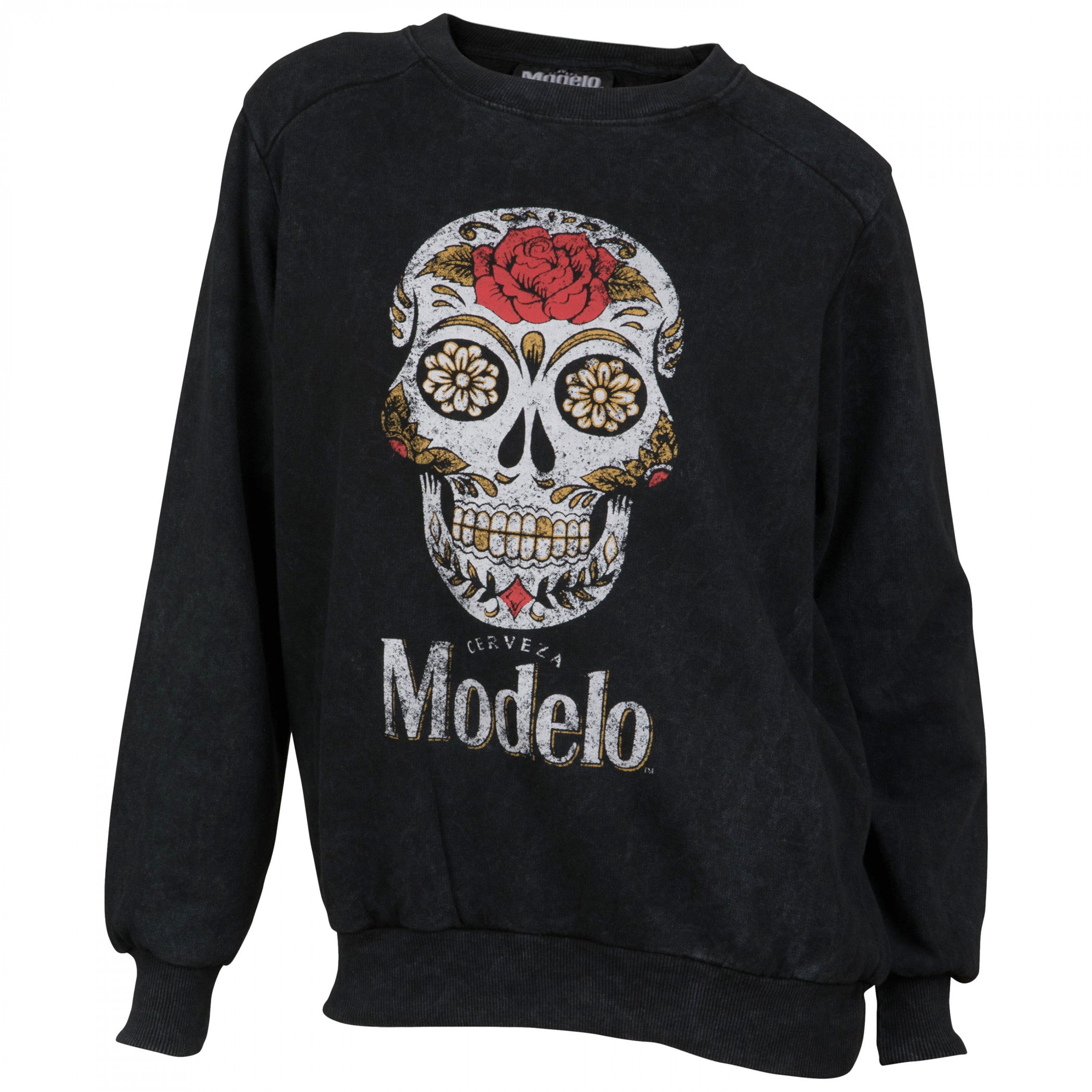 Officially licensed Modelo Especial Sugar Skull Logo Women's Crew Sweatshirt. This black "Modelo Especial" Women's Crew Sweatshirt is made from cotton and features the classic "Modelo Especial" Sugar Skull logo on the front.