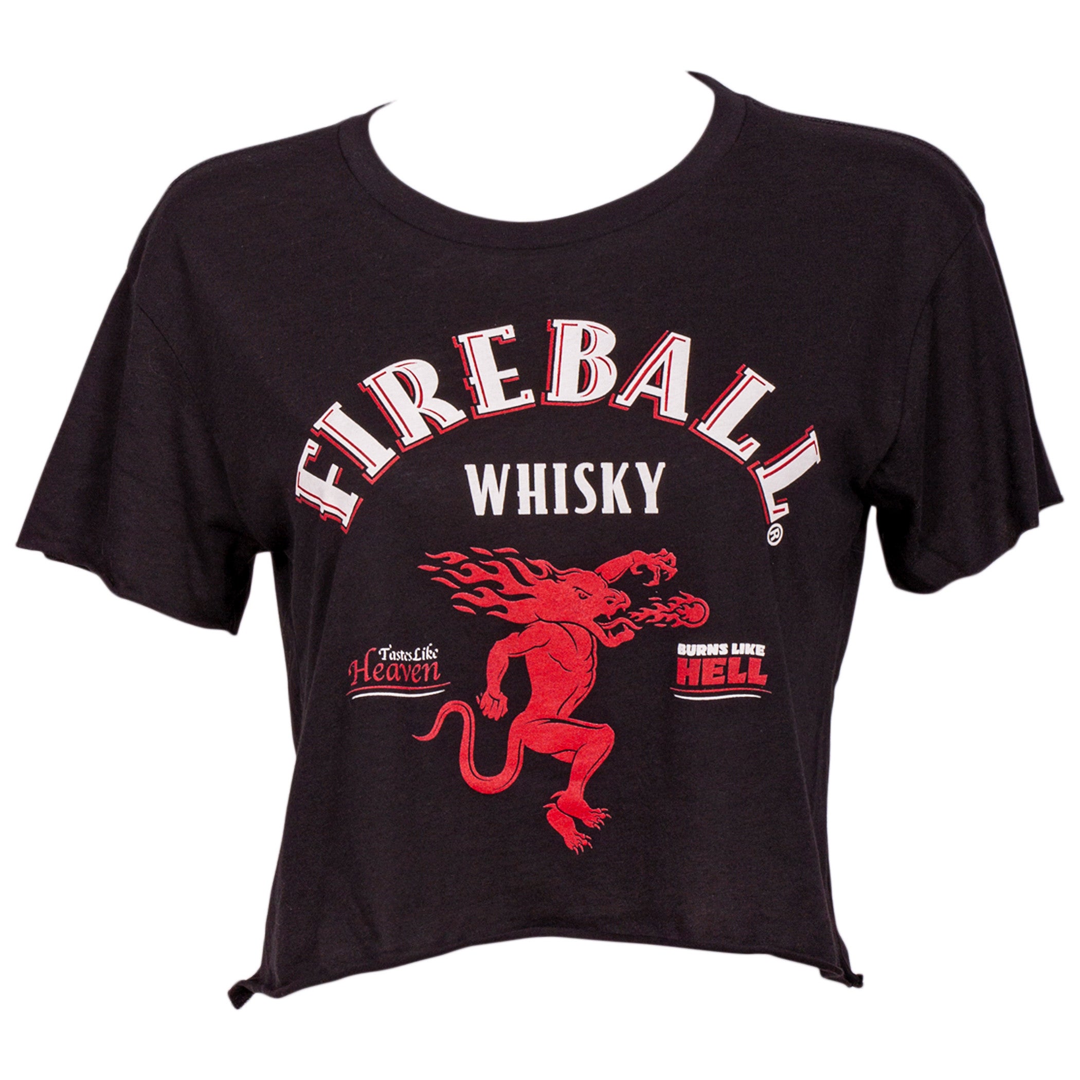 Officially licensed Fireball Whisky Women's Crop Top T-Shirt. Made from cotton, this black women's crop top t-shirt features the "Fireball Whisky" logo and mascot on the front.