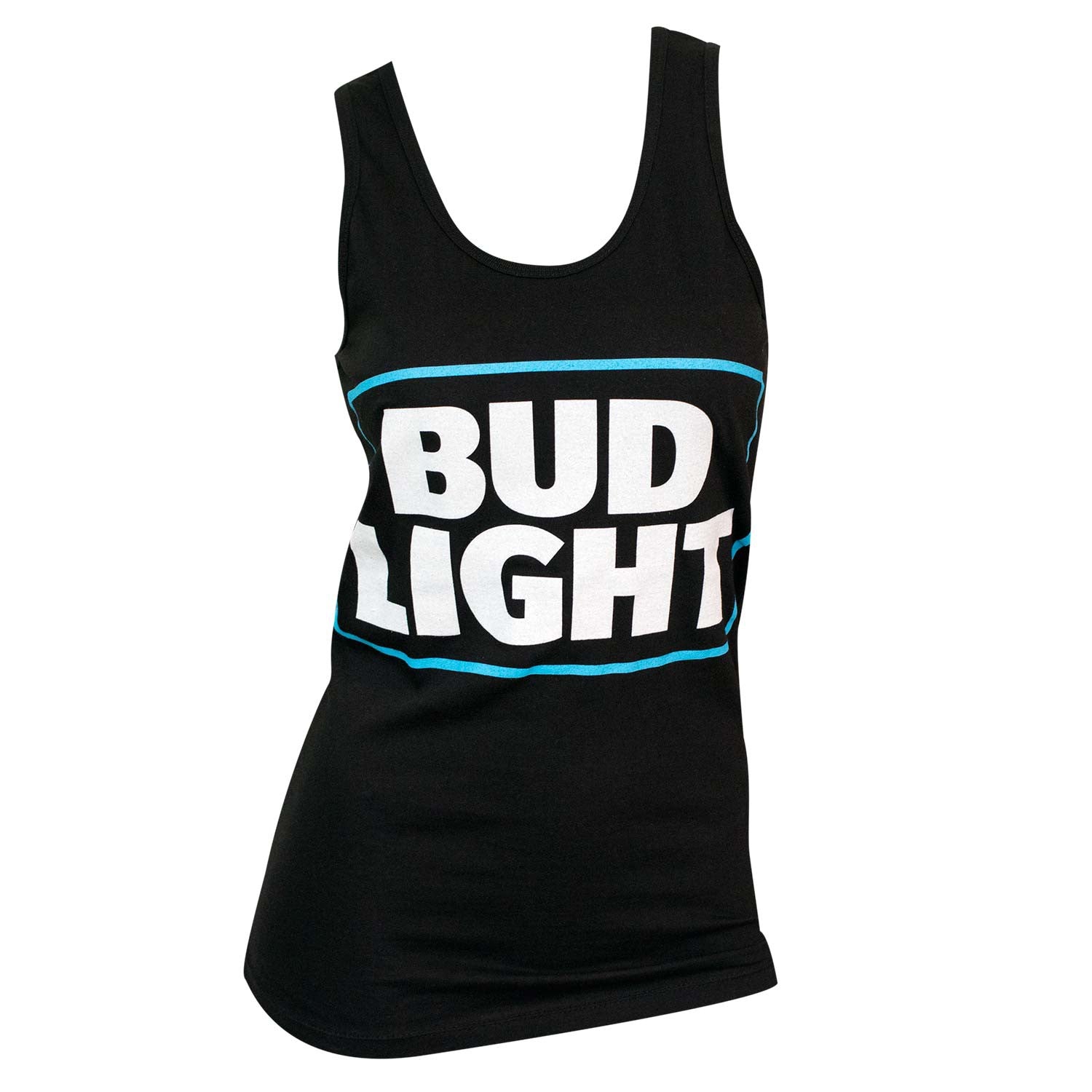 Officially licensed women's black Bud Light tank top. Made from a cotton/poly blend.