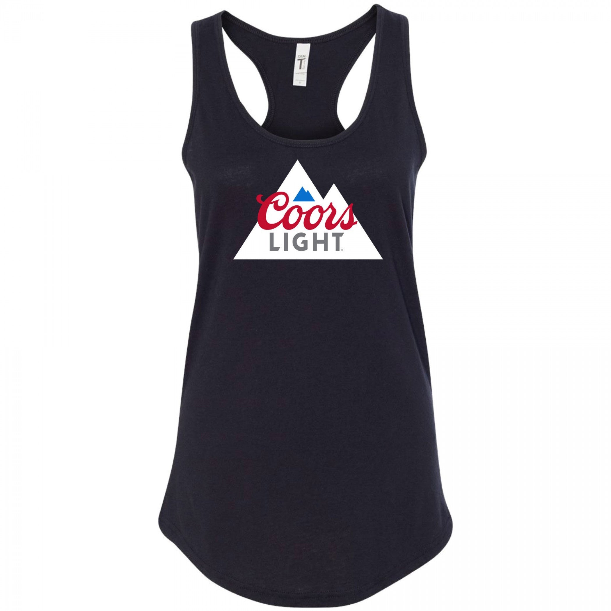 Officially licensed Coors Light Mountain Logo Women's Racerback Tank Top. This black "Coors Light" Women's Racerback Tank Top is made from cotton and features a classic "Coors Light Mountain" logo on the front.