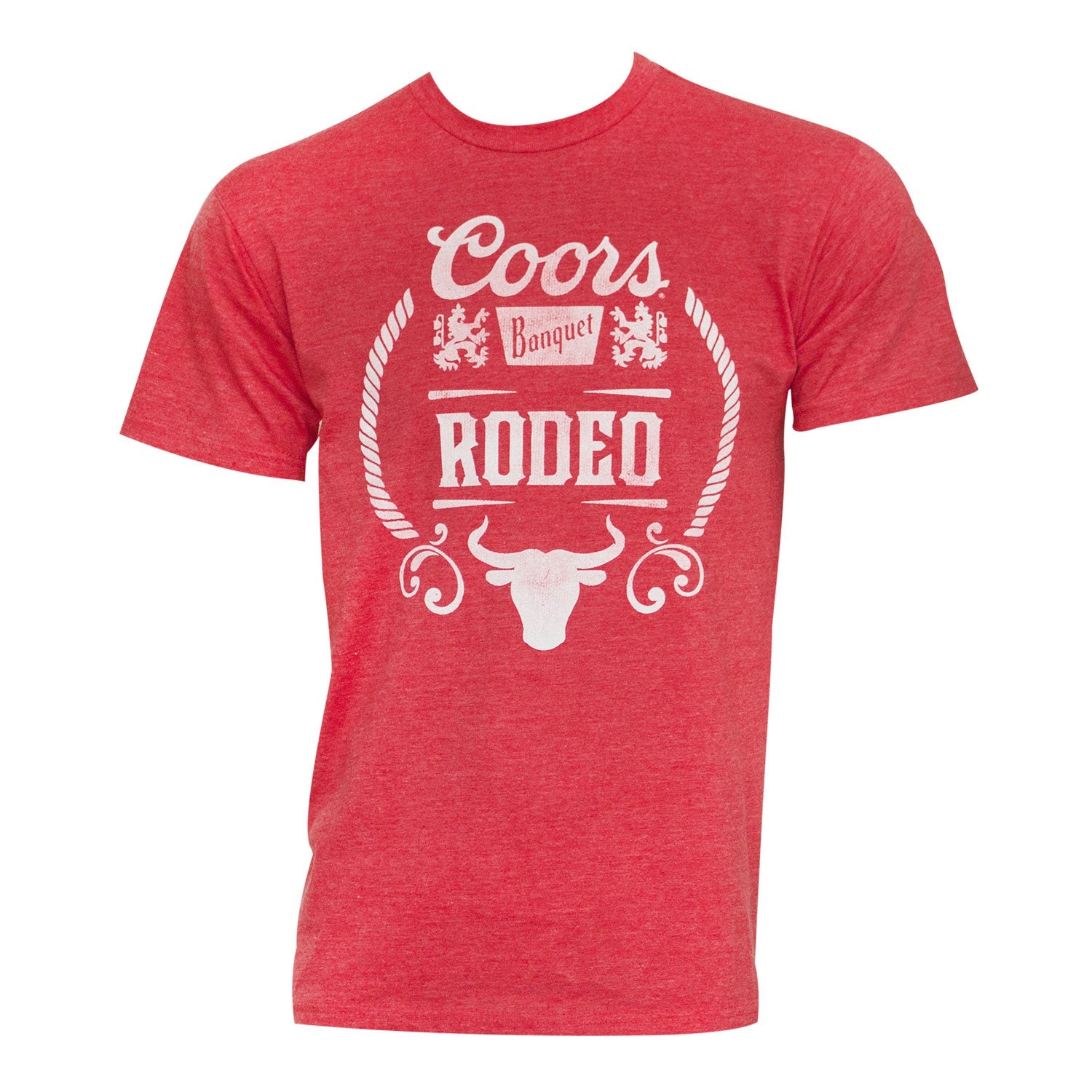Men's red Coors Banquet t-shirt. Made from a cotton/poly blend, this tee features a retro "Rodeo" logo on the front. Officially licensed.