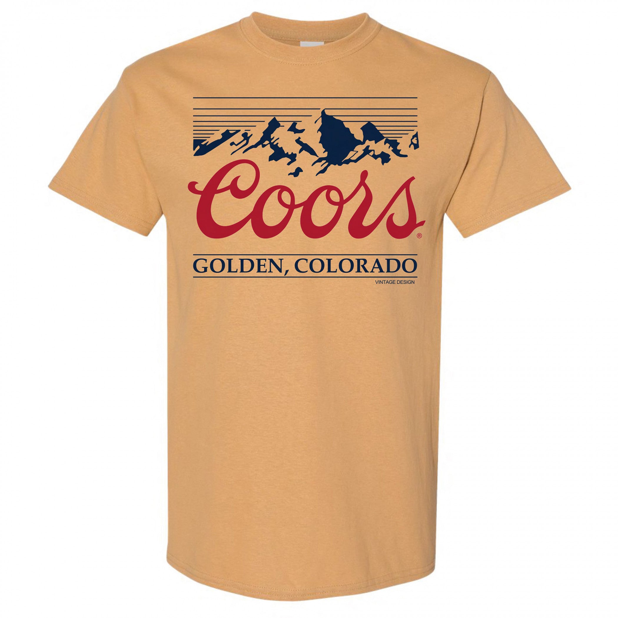 Officially licensed Coors Vintage Mountain Lines T-Shirt. This gold t-shirt is made from cotton and features a vintage "Coors Banquet" Mountain Lines logo on the front.