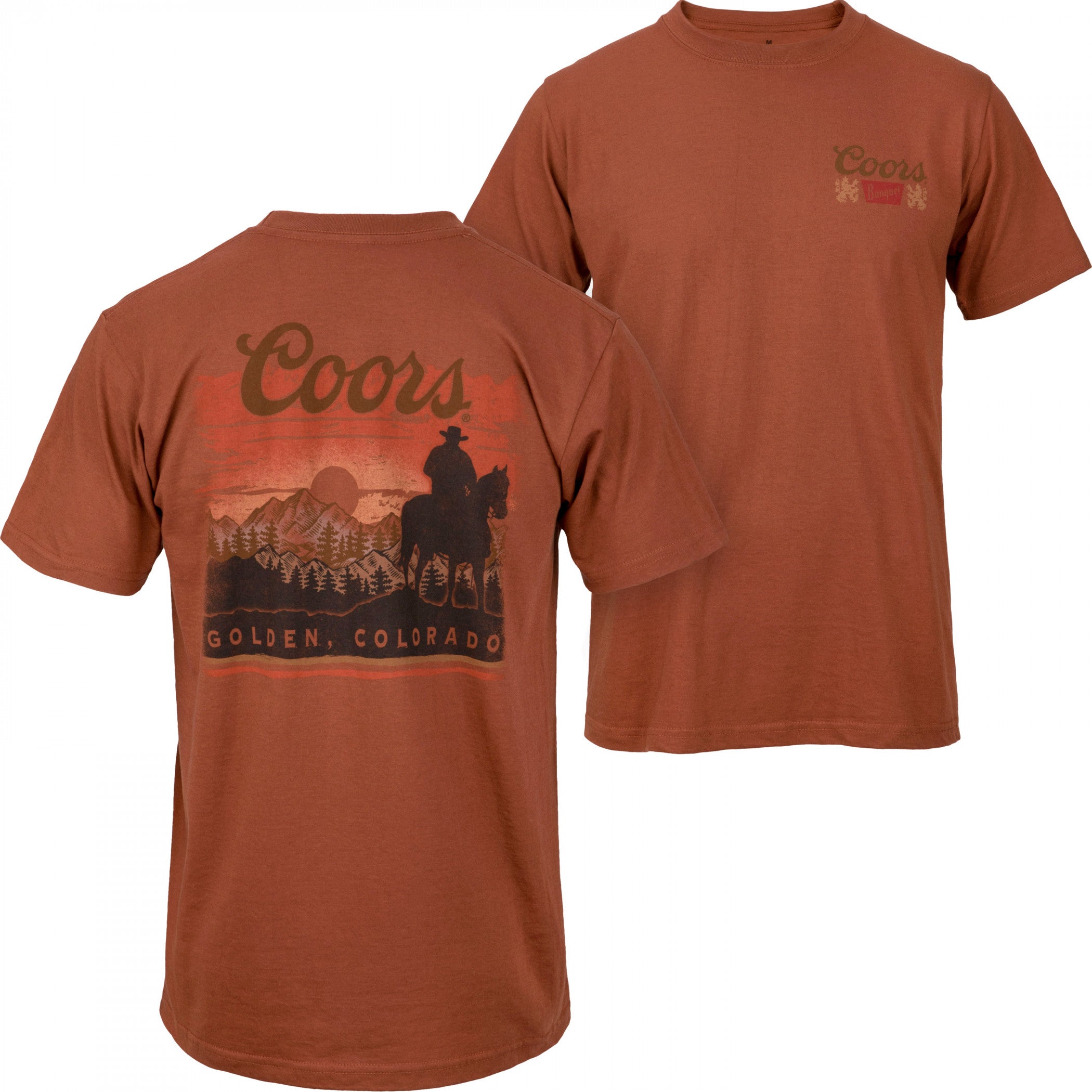 Officially licensed Coors Sunset in Golden Colorado Rust Colorway Front/Back Print T-Shirt. This rust colored "Coors" t-shirt is made from cotton and features a snazzy "Coors" Sunset in Golden Colorado logo printed on the front and back.