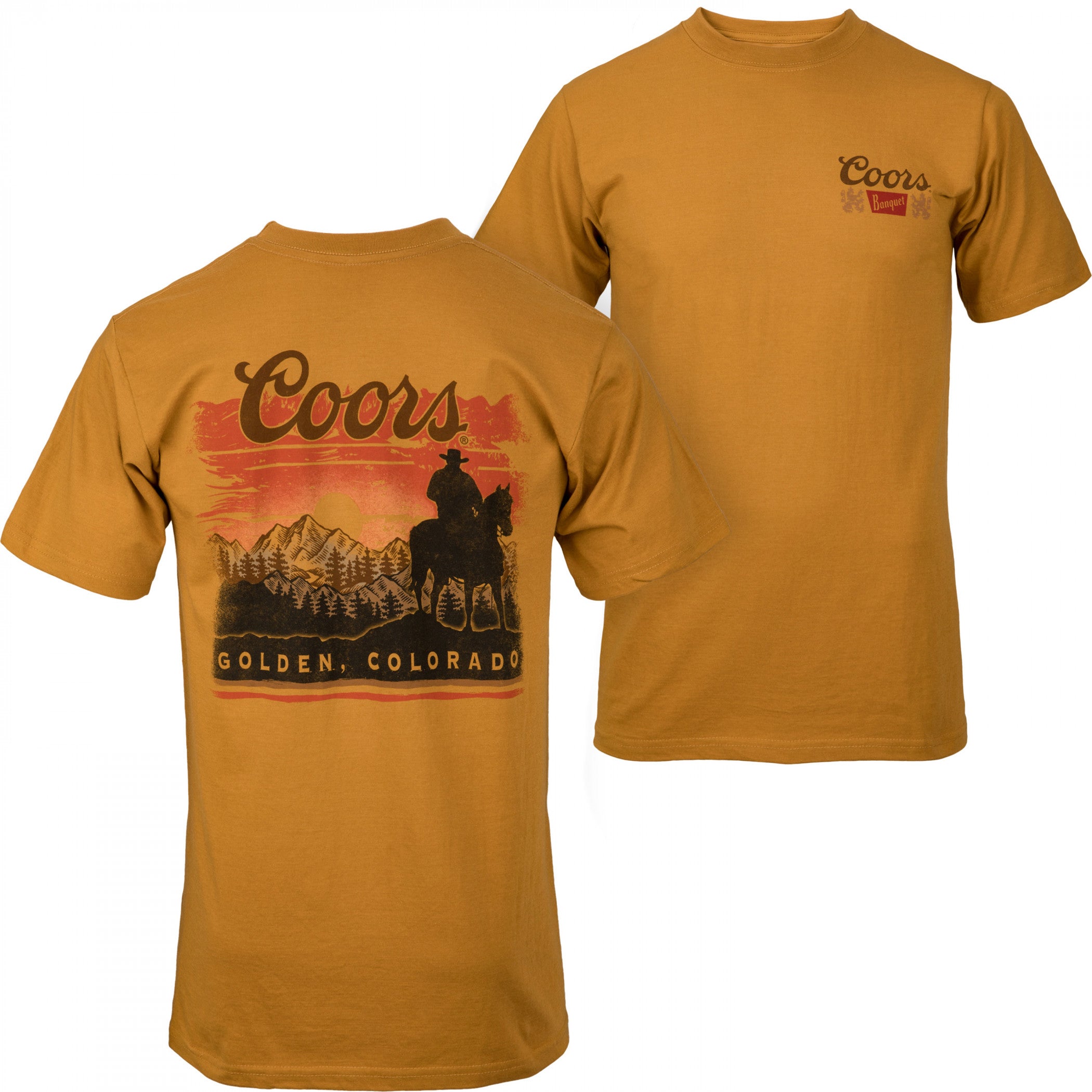Officially licensed Coors Sunset in Golden Colorado Wheat Colorway Front/Back Print T-Shirt. This yellow "Coors" t-shirt is made from cotton and features a snazzy "Coors" Sunset in Golden Colorado logo printed on the front and back.