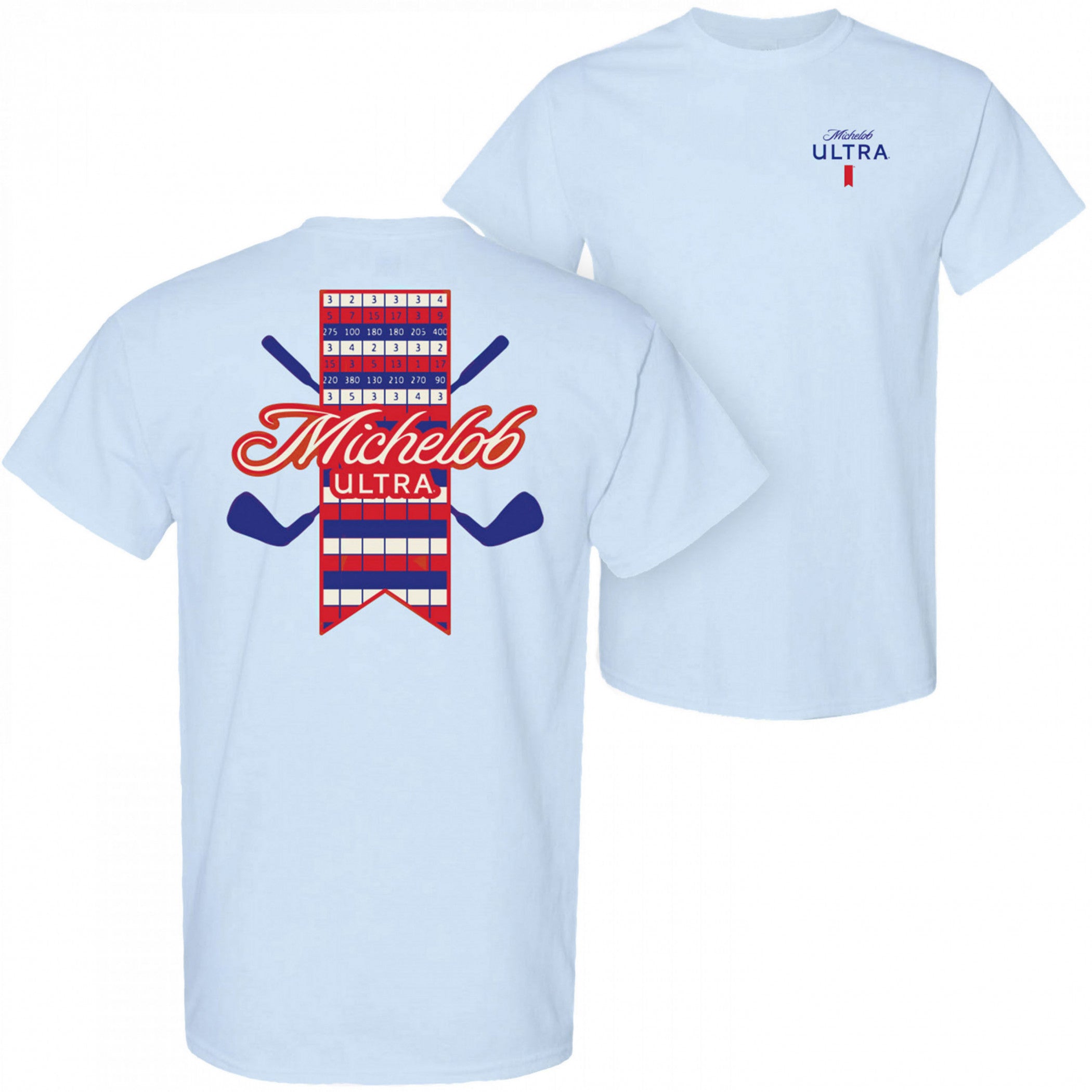 Officially licensed Michelob Ultra Golf Scorecard Blue Colorway Front/Back Print T-Shirt. This Blue "Michelob Ultra" t-shirt is made from cotton and feature a classic "Michelob Ultra" Golf Scorecard logo design printed on the front and back.