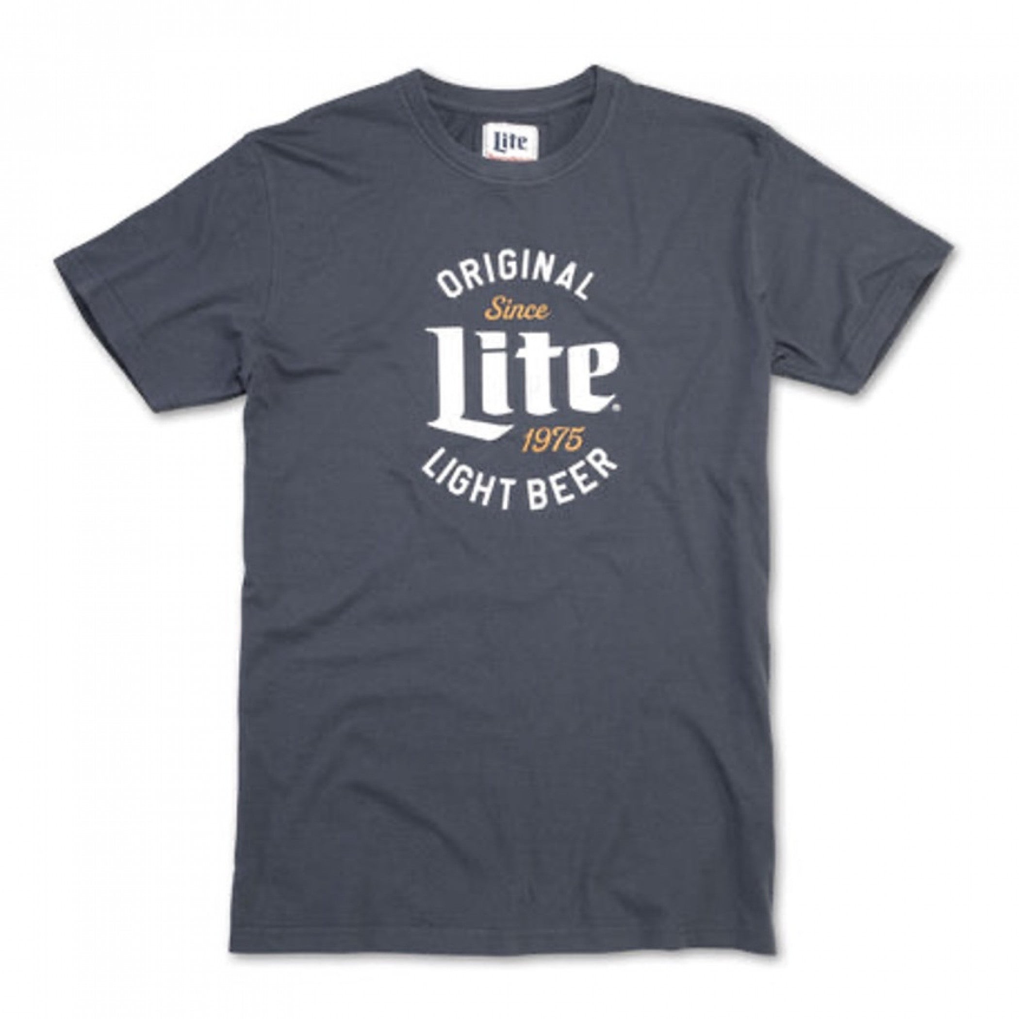 Officially licensed Miller Lite Original Light Beer Since 1975 Brass Tacks T-Shirt. This "Miller Lite" blue t-shirt is made from 100% cotton and features a distressed “Since 1975” design with classic "Miller Lite" logo. Heavy vintage wash. Trim athletic fit. Ribbed knit collar.