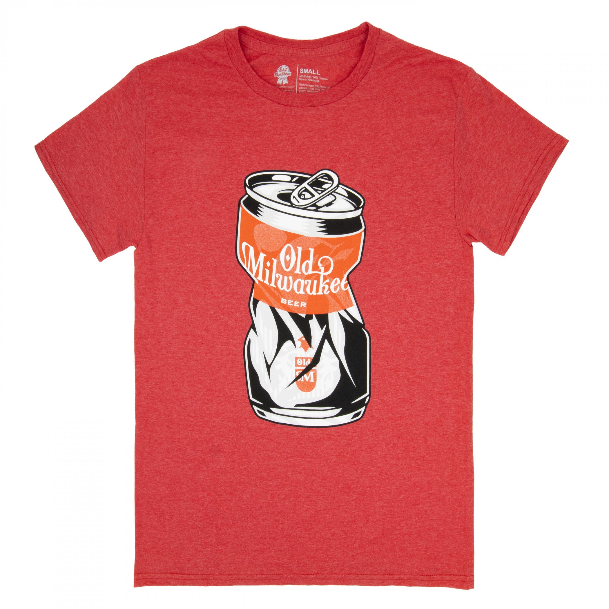 Officially licensed Old Milwaukee Crushed Can T-Shirt. This red "Old Milwaukee" t-shirt is made from cotton and features a classic "Old Milwaukee" Crushed Can logo design on the front.
