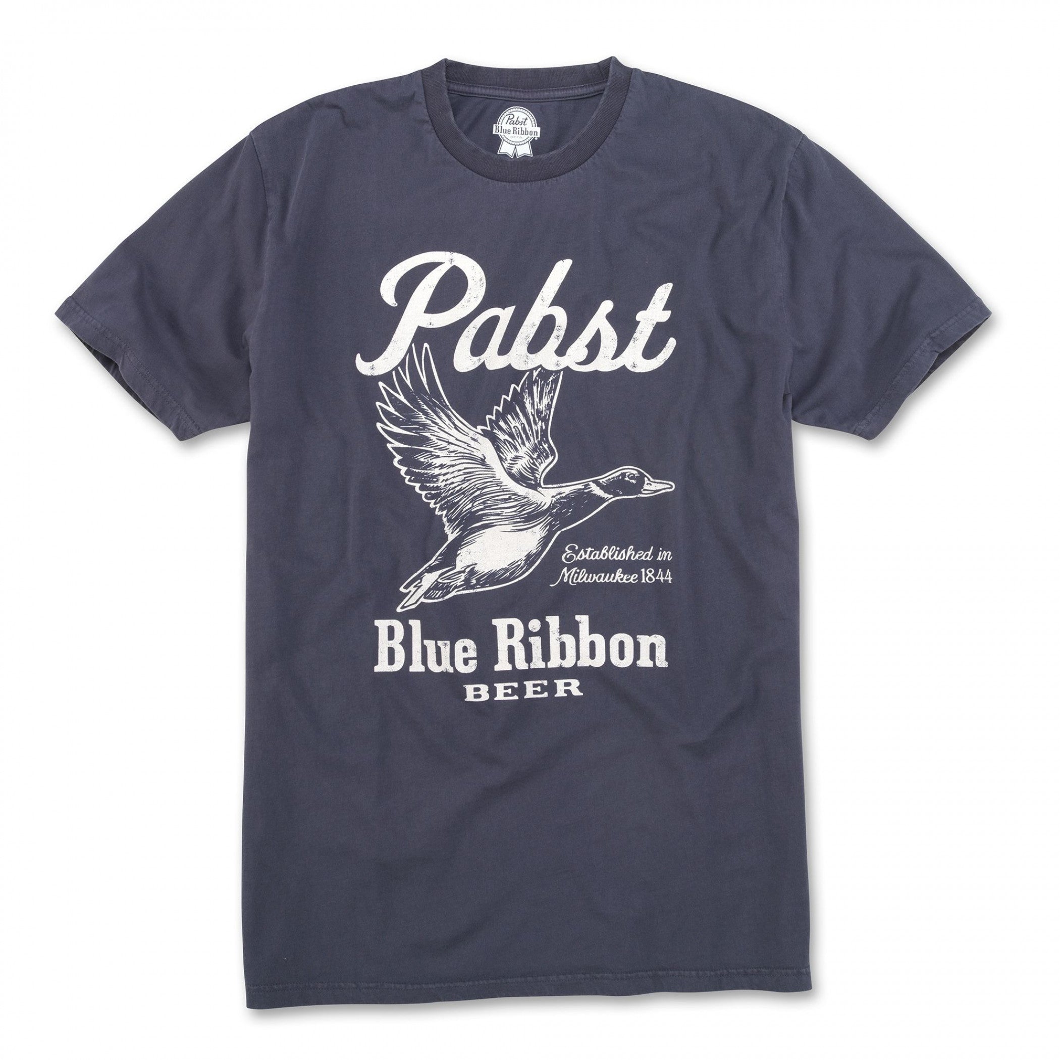 Officially licensed Pabst Blue Ribbon Beer Duck Navy T-Shirt. This navy blue "Pabst Blue Ribbon Beer" t-shirt is made from cotton and features a scenic "Pabst Blue Ribbon Beer" Duck logo graphic.