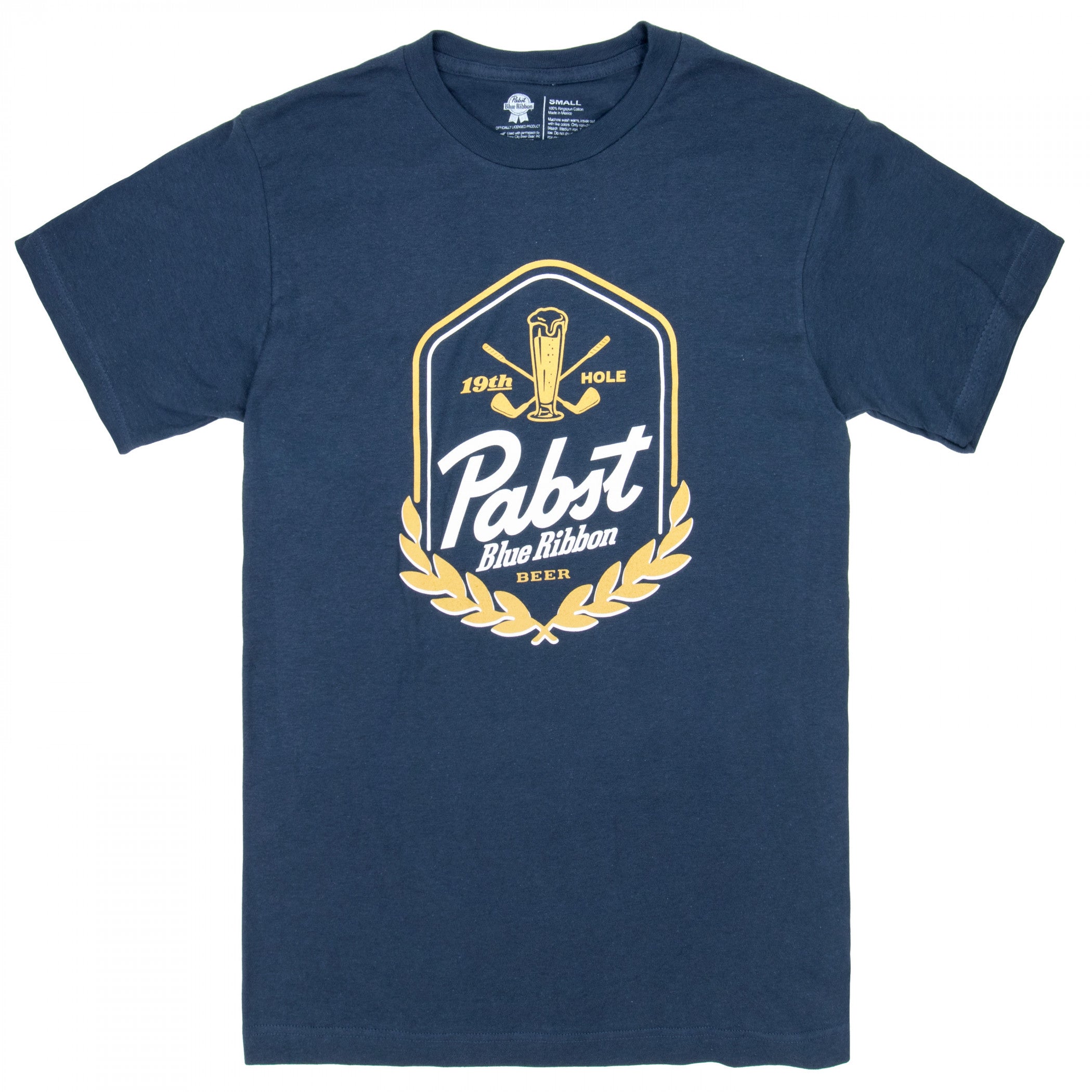 Officially licensed Pabst Blue Ribbon Golf 19th Hole Navy Colorway T-Shirt. This blue "Pabst Blue Ribbon" t-shirt is made from cotton and features a classic "Pabst Blue Ribbon" Golf 19th Hole logo design printed on the front.